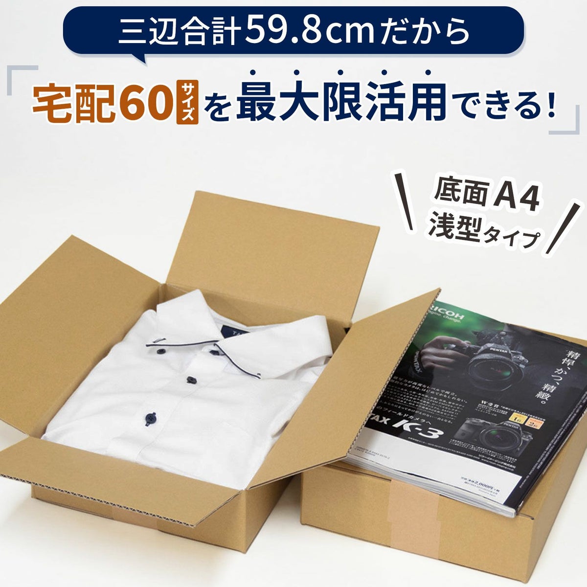 宅配60サイズのダンボール箱を、小型荷物の発送に使いやすい定番サイズでラインナップ。 EC通販やフリマアプリの発送、書籍・小物の梱包など、日常的な出荷業務に幅広く対応できます。 ボックスバンクなら、高品質な国産ダンボールを低価格&最短当日出荷でお届けします。